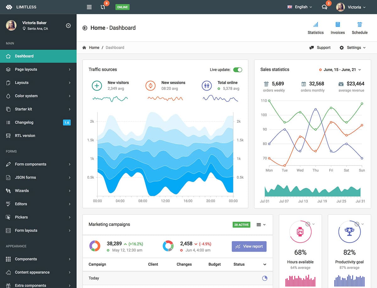 在图形和图表中显示数据时,向小部件添加工具提示和其他悬停激活的项目和动画会派上用场。 由于图表库的选择,在使用这个流行的 Bootstrap 管理模板可视化数据时,您可以获得很多选择。 还有大量其他类型的小部件库可以添加到您的布局中,包括消息、支持票、最新帖子、日历条目和活动等等。 直到您查看了 Limitless 演示,您才会真正体会到这个模板有多少功能和效果。