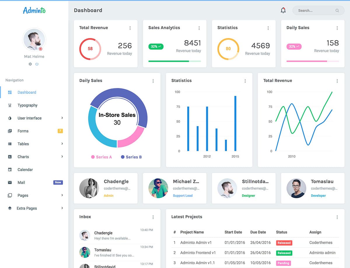 六个主要的管理演示看起来非常现代,风格相似。 但是,它们确实具有不同的布局和导航样式,为您提供了一组很好的选择。 颜色选择非常匹配,字体图标的使用有助于为设计增添一些额外的风格。 事实上,在使用 Adminto 设置管理页面时,有超过 1,700 种字体图标可供选择。