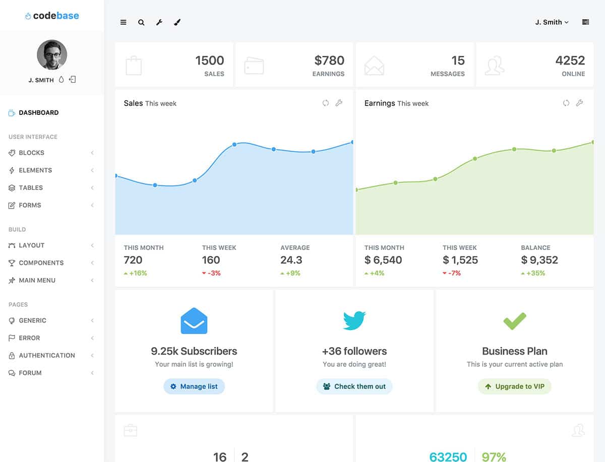 无论您是为网站设计自定义仪表板,还是需要为您的产品创建专业页面和控制面板,Codebase 的风格和功能都值得一试。 模块化设计使您能够快速挑选要包含在页面上的元素。 由于 Flexbox 在整个 Codebase 中都使用,因此很容易确保您的 UI 及其元素都完美对齐并位于正确的位置。