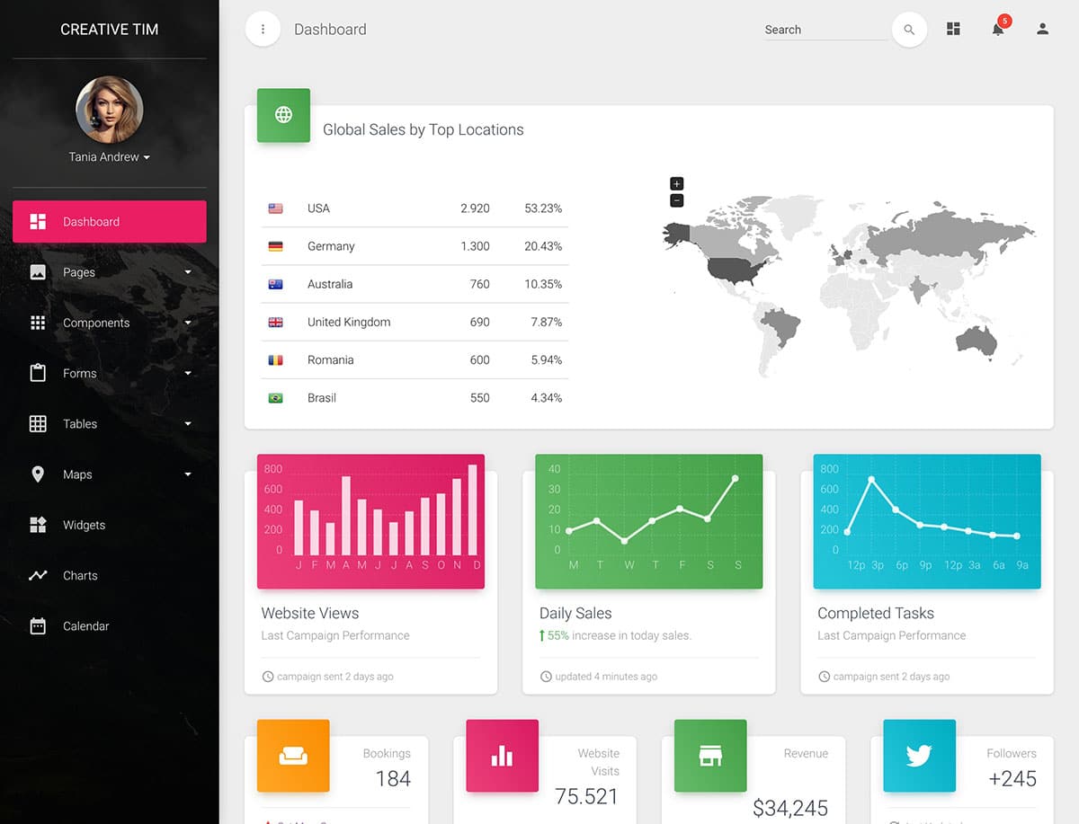 得益于可折叠的菜单和不同的侧边栏布局,Material Dashboard Pro 非常适合需要显示大量选项和元素而又不会压倒用户的项目。 用户界面不仅设计高雅,使其成为企业项目的理想选择,而且还具有精选的执行良好的动画,以帮助保持用户的注意力。