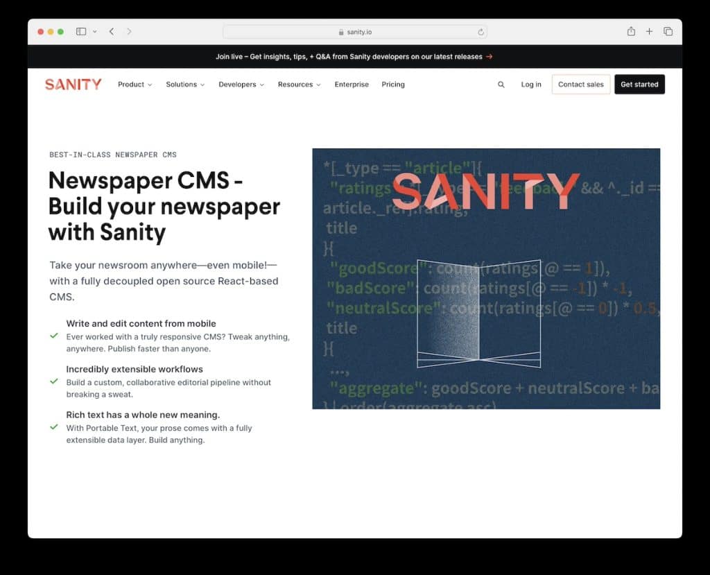 Sanity 适合具有前瞻性思维的新闻机构和数字出版商,他们需要高度可定制、移动响应和协作的平台来讲述动态、数据丰富的故事。