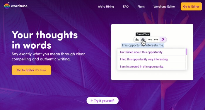 Wordtune 是一种写作工具,它使用先进的 AI 工具和语言模型来编写您的内容。 借助 Wordtune 的 AI,它首先了解内容的上下文,然后相应地对其进行重写,以提高内容的可读性。 在这里,您可以选择以多种色调重写您的材料,例如非正式和专业。