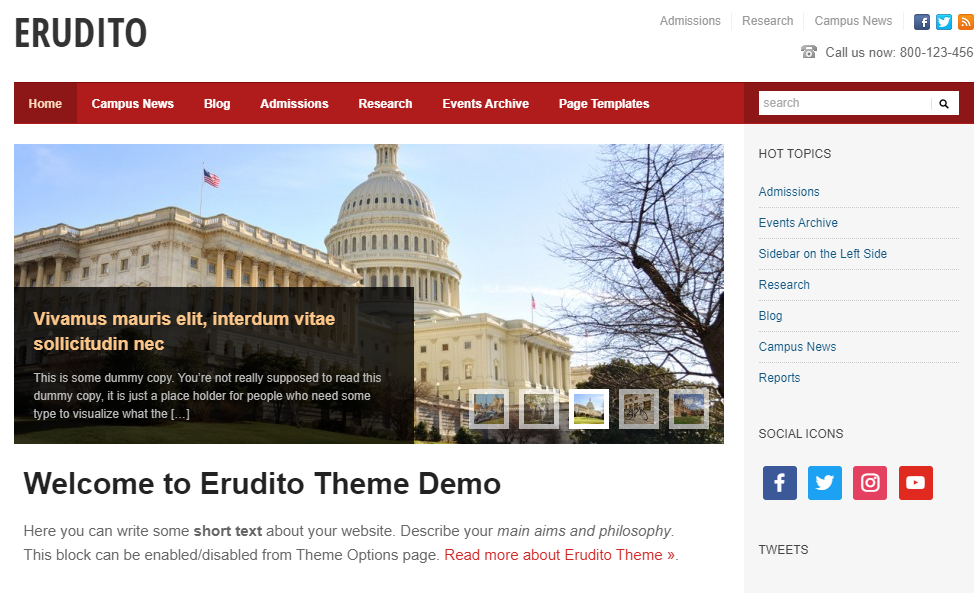 AcademicaPro 主题在主页上有一个特色帖子滑块,为构建者内容提供 12 个自定义小部件和一个 Twitter 提要。