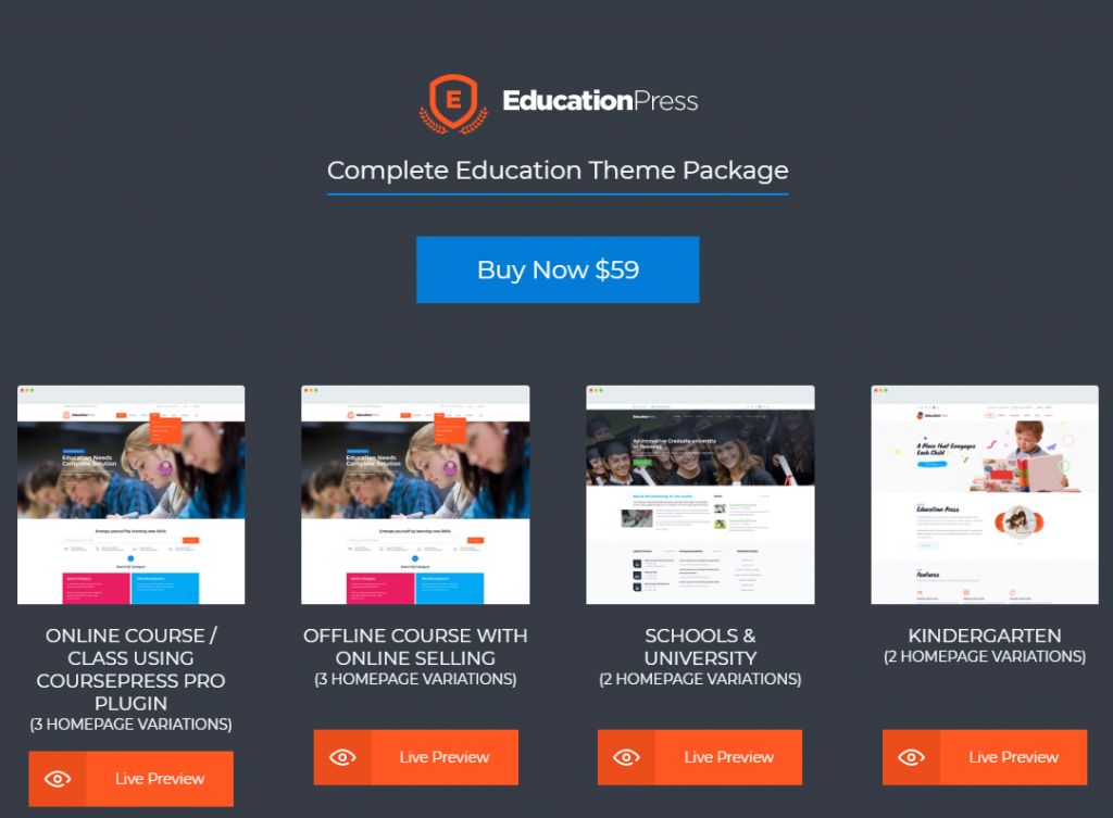 该主题带有 9 个不同的演示,支持 LearnPress 插件,除了为已完成的课程作业颁发证书外,还可以为课程分配说明。 通过预订和销售门票进行活动管理。 具有用于构建课程列表的拖放构建器、用于销售课程的 5 个支付网关和一个测验管理选项。