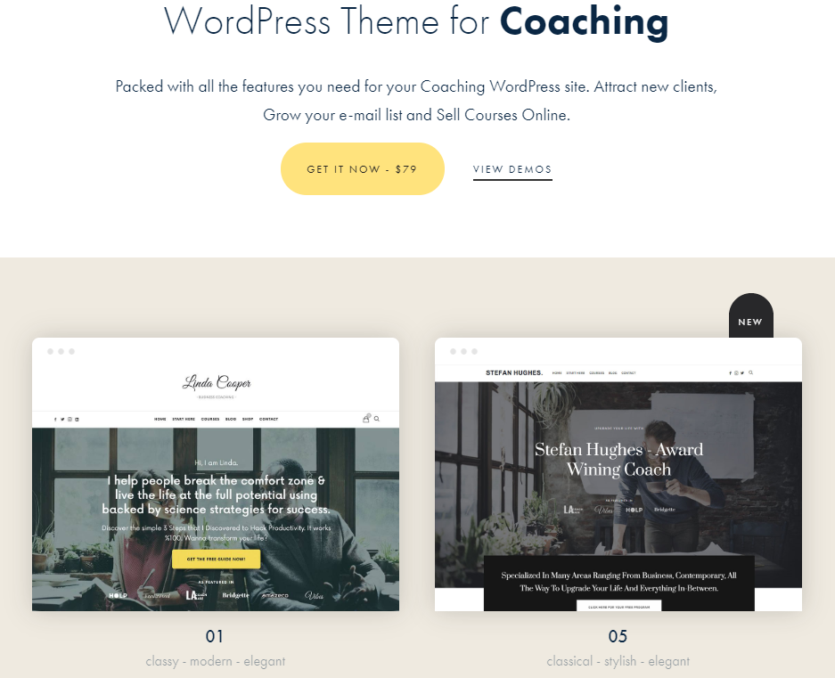 这个 WordPress 设计主题包含教练和在线课程、演讲者和教练培训演示,以及使用 LearnPress 创建和销售课程和活动的能力。