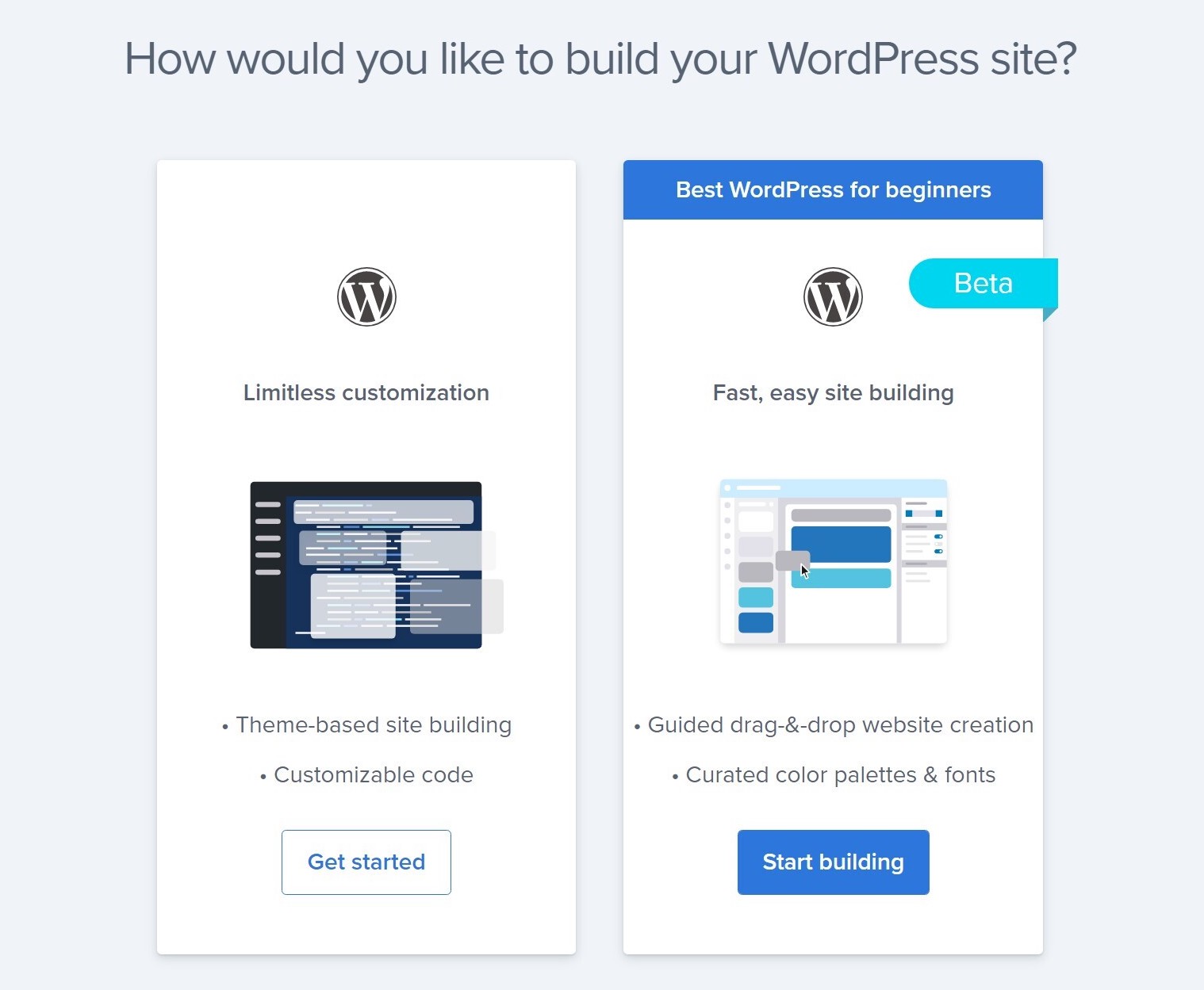 Bluehost 会立即询问您要如何构建您的网站,以及是否要在您的设置中安装 WordPress。 他们甚至会问您是否要以经典模型(通过选择主题并修改它)在您的网站上工作,或者使用 Bluehost 的新构建器界面。