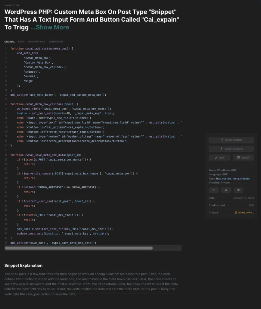 这是一项令人印象深刻的技术,它利用人工智能的前沿技术专门为 WordPress 和生态系统中的产品创建代码片段。