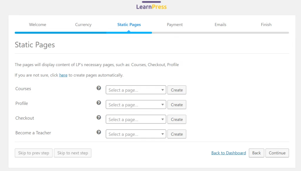 LearnPress 将引导您选择课程、个人资料、结帐和讲师页面。 如果您使用的是 Eikra,这部分将是小菜一碟。
