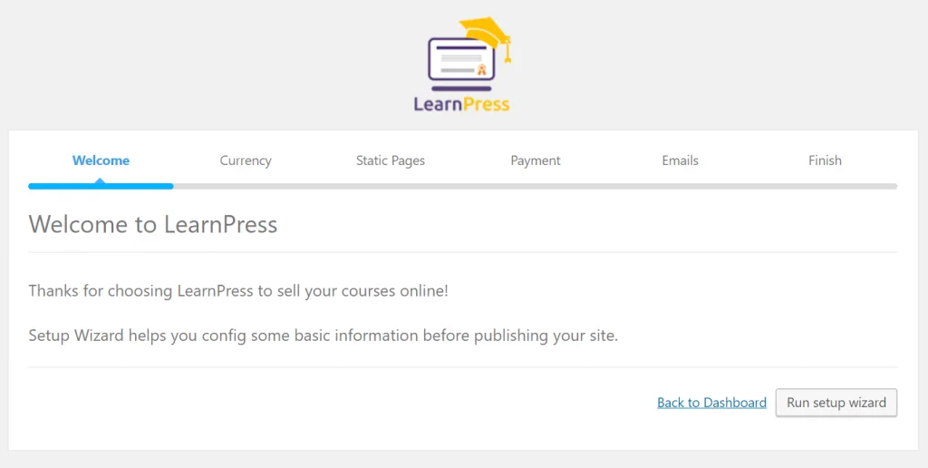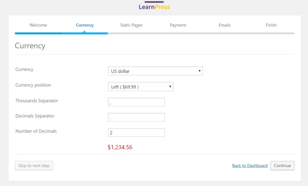 在您的仪表板上找到 LearnPress 部分并单击它,然后再设置您的详细信息。 您可以包含您的货币信息——您在您的网站上接受的货币。 Eikra 不是创建您的页面,而是提供 LMS 网站可能需要的所有页面。 您所要做的就是定制他们的内容以符合您和您的品牌的需求。