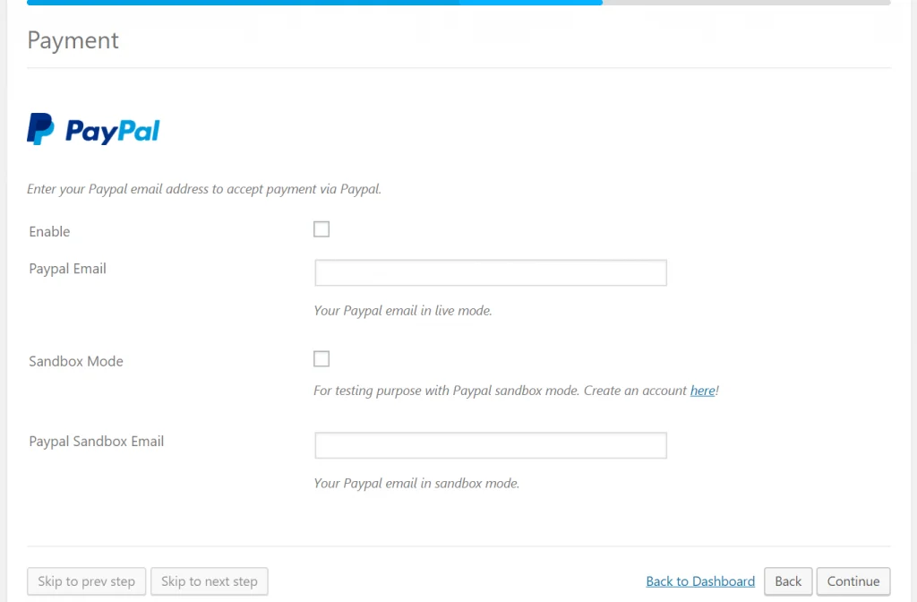 您可以使用“付款”选项卡来选择是否要直接从您的网站收款。 此选择会在您的页面上提示一个购物车,用户可以使用该购物车快速购买您的课程。 然后,您可以添加要收款的帐户的详细信息。 您可以输入 PayPal 电子邮件。 然后,您可以激活发送给您的学生和老师的电子邮件。