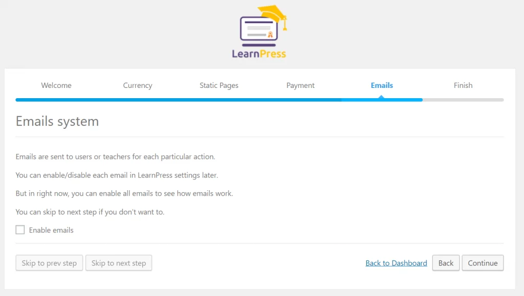 下一部分将要求您选择是否从您的站点接收电子邮件。 您也可以稍后在 LearnPress 设置中选择接收电子邮件或禁用该选择。