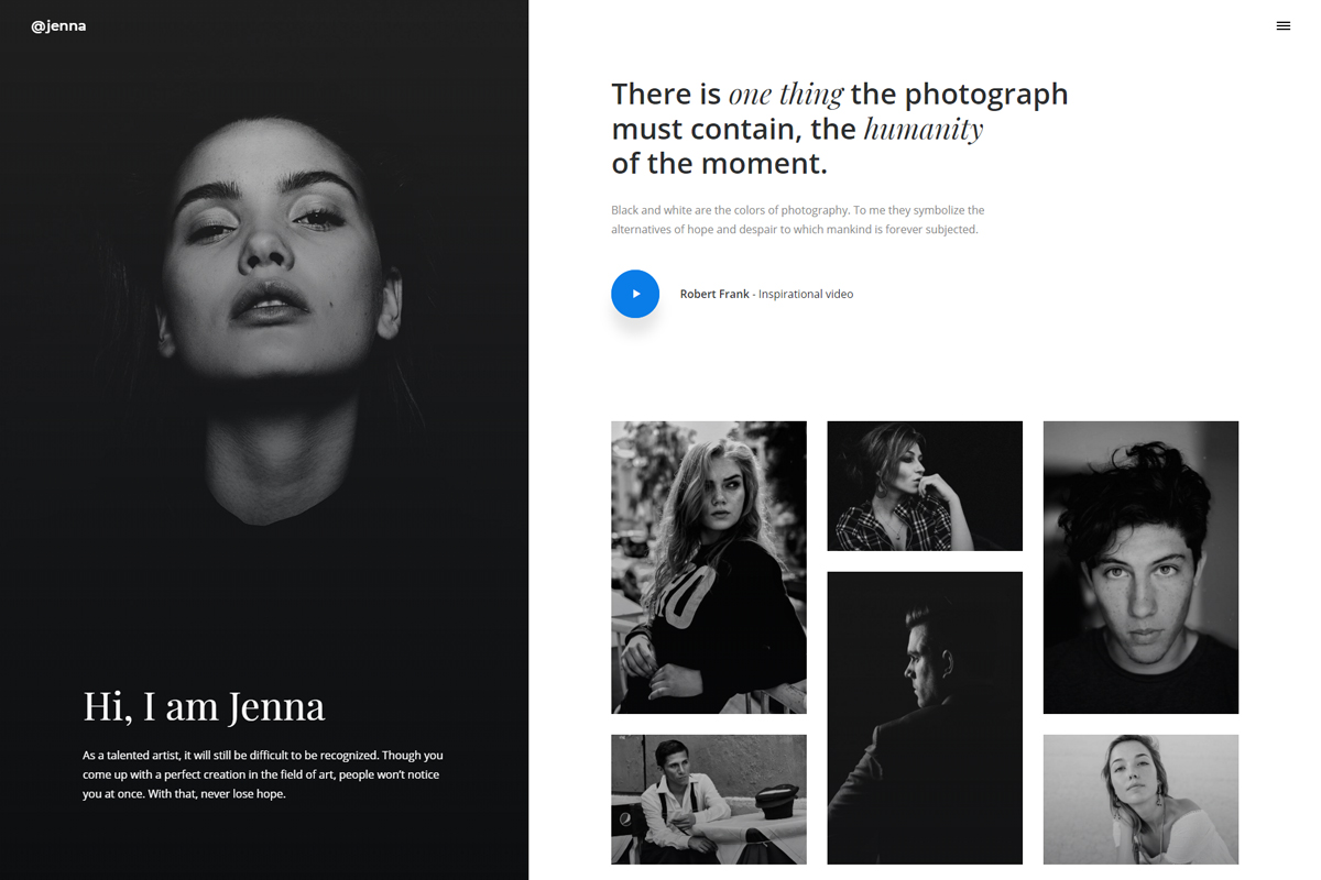 投资组合布局中还有足够的空间来添加有关您自己或您的工作的文本。 同样,弹出式导航效果在此演示中得到了很好的利用,帮助您避免在网站导航元素上浪费空间,否则可能会掩盖您的工作。