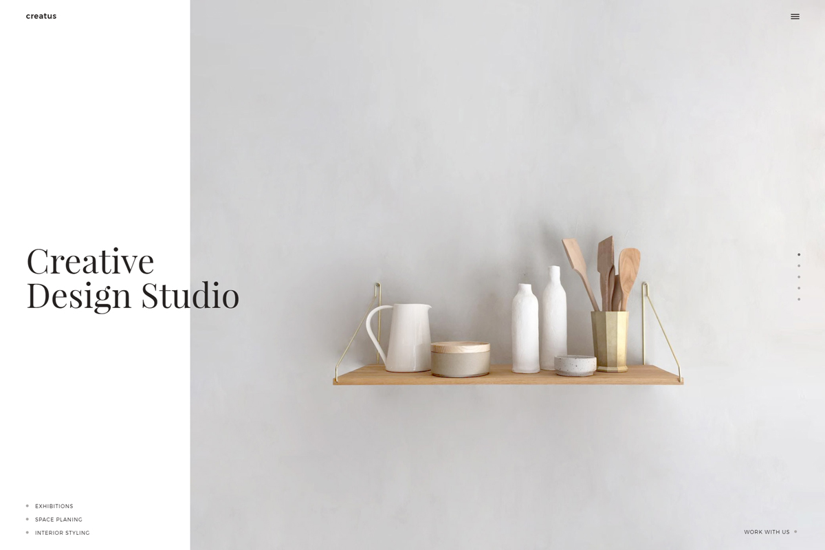 这个用于构建设计工作室网站的演示具有适当的创意设计。 布局也很有趣,带有主页导航系统,可以轻松跳转到网站首页的不同部分。 包含指向您网站上其余页面的所有链接的弹出式侧面板也是一个不错的补充。