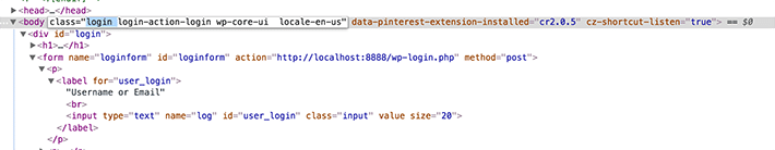 使用浏览器开发工具,可以研究结构。 检查时,您会看到已经为正文设置了背景样式。 事情很一般,所以让事情更具体将确保您不会做出任何您不想要的全局更改。 有一个应用于正文的类,称为.login ,它将非常有用(这是我们在上面的示例中用于徽标的类,因为它是选择器的一部分)。