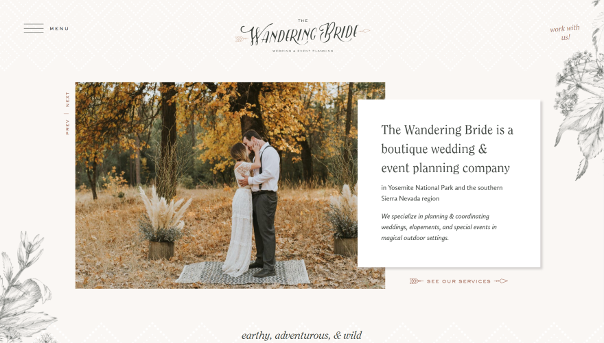 本网站由 Kelsey Spectre 提交。 它用花卉艺术品框住了布局。 标题将汉堡菜单放在左侧,将 CTA 放在右侧。 滑块显示设置的照片并包括垂直放置的导航。 文本模块与此重叠,并提供有关公司的信息,并在其下方带有样式链接以查看服务。 下面是一个带有优雅字体标语的部分。 带有关于信息的部分包括与上一部分重叠的图像。 推荐显示在全宽部分,名称在一侧。 我喜欢底部的 CTA,它遵循与网站其余部分相同的设计,并包含一个文本模块,文字就像卡片一样。 自定义页脚包括嵌入的 Instagram 提要。