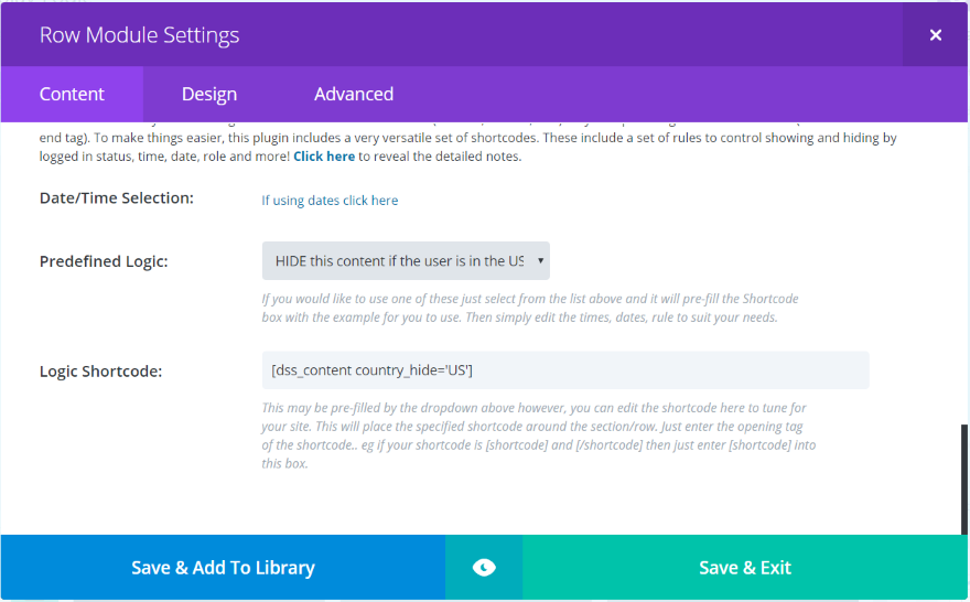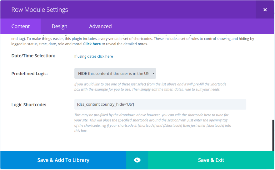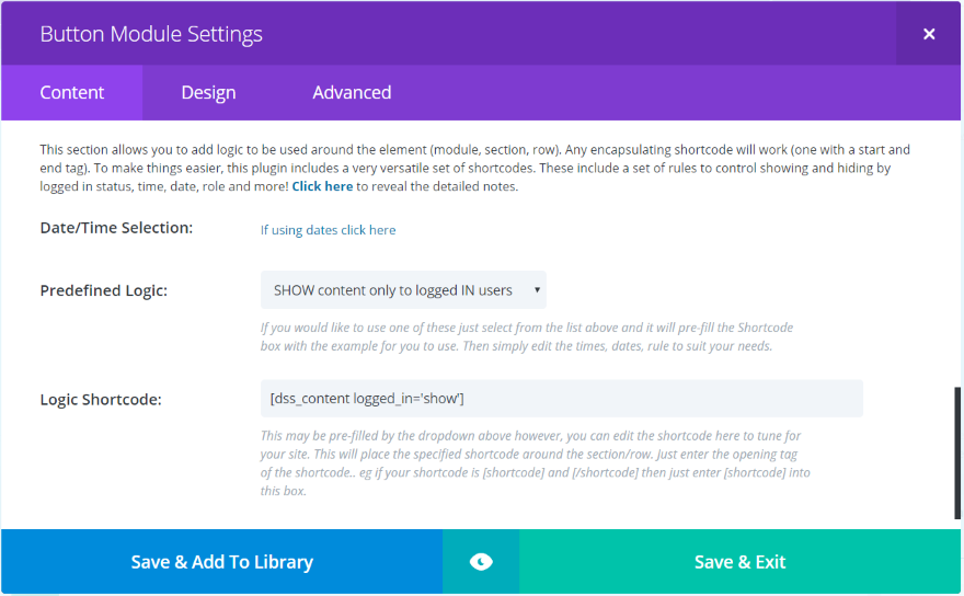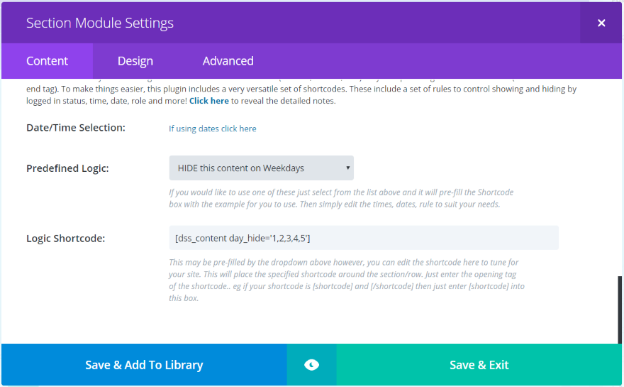 现在,显示逻辑已添加到后端 Divi Builder 内“内容”选项卡中的所有部分、行和模块。 这些功能包括日期和时间选择、一个下拉框,您可以在其中选择预定义的逻辑,以及一个显示插件为您的逻辑创建的短代码的框。