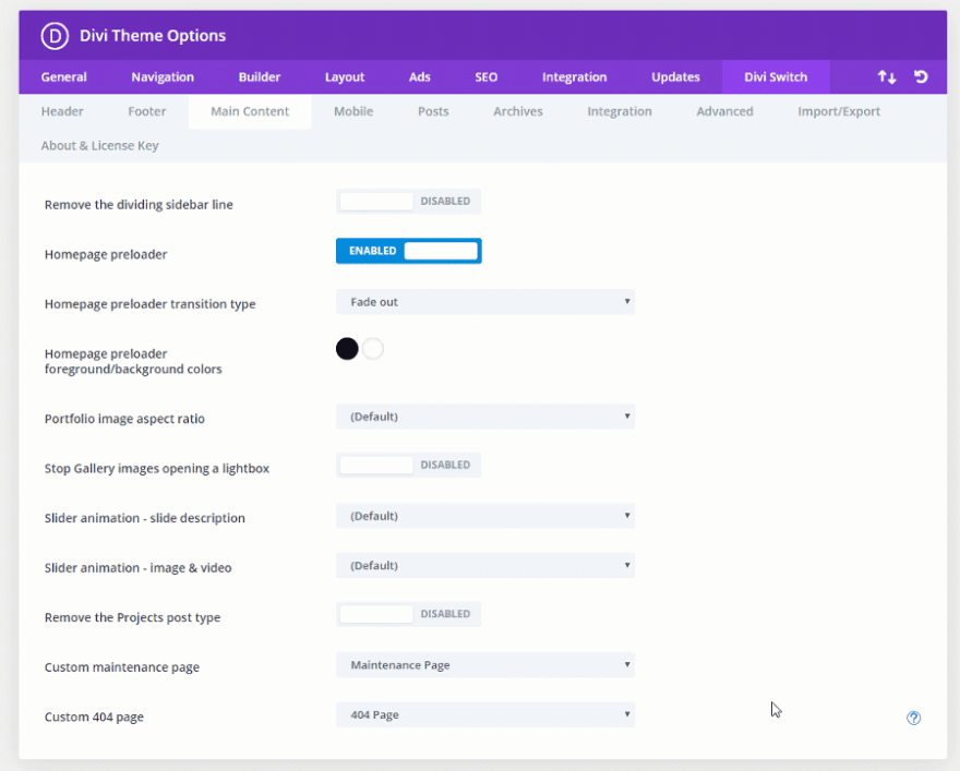 主要内容选项卡添加了 11 个开关和自定义项。 您可以删除侧边栏分隔线,添加主页预加载器并设置类型和颜色,更改投资组合图像比例,防止图像在灯箱中打开,调整滑块动画,删除项目帖子类型,添加自定义维护页面,以及添加自定义 404 页面。