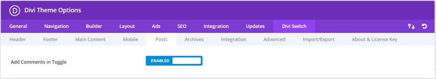 Divi Switch 已重新设计,所有设置已从管理菜单中的单独位置移至 Divi 主题选项页面。 开关本身分布在 Divi 主题选项中新的“Divi Switch”选项卡下的子选项卡中。