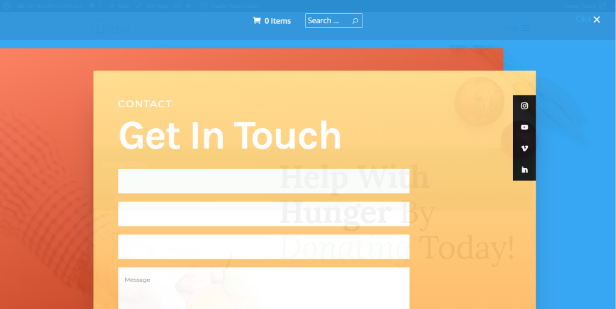 单击汉堡菜单将打开全屏菜单并显示我选择的 Divi 布局。 它是半透明的,因此您可以在后台看到该网站。 它还包括一个关闭按钮。