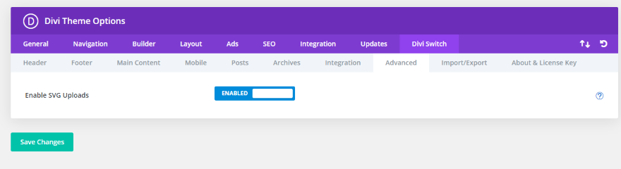 高级选项卡允许您上传可缩放矢量图形 (SVG) 以获得更清晰的徽标、图标和其他图像。 由于 WordPress 默认阻止 SVG,这是将这种图像格式与 Divi 一起使用的好方法。
