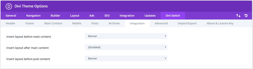 集成选项卡可让您将 Divi 布局插入特定位置,包括主要内容之前、主要内容之后和发布内容之前。 从下拉列表中选择布局。