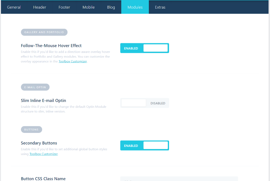 Modules选项卡提供了添加跟随鼠标悬停效果的设置,添加了一个纤薄的电子邮件选择(它提供了三个不同选项的 CSS)、辅助按钮(它添加了一个新的自定义层)和许多调整。