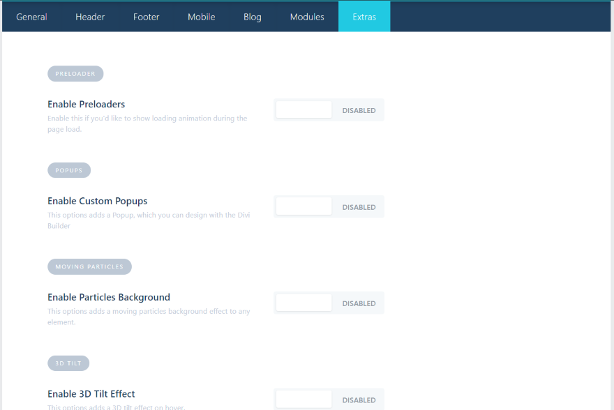 Extras选项卡包括预加载器、弹出窗口、粒子背景、3D 倾斜效果和模块的视差滚动。