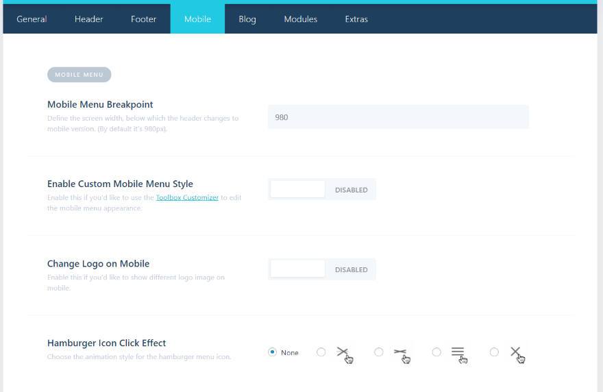 移动设置包括输入移动菜单断点的字段(菜单从桌面更改为移动时的确切屏幕宽度)、自定义样式、更改徽标、选择汉堡图标单击效果、折叠嵌套子菜单和启用几个 CSS 类。 CSS 类允许您反转列并使文本、模块和按钮居中。