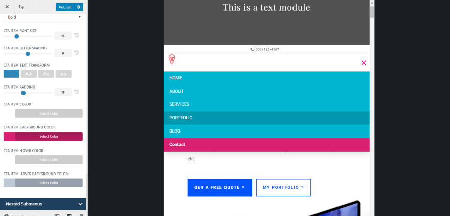 在此屏幕中,我正在为移动菜单的背景颜色、悬停背景颜色和汉堡菜单设置样式。 我已将主菜单项的文本更改为全部大写,并保留了 CTA 文本标准。 我还更改了 CTA 菜单项的背景。 您还可以调整菜单和图标大小。