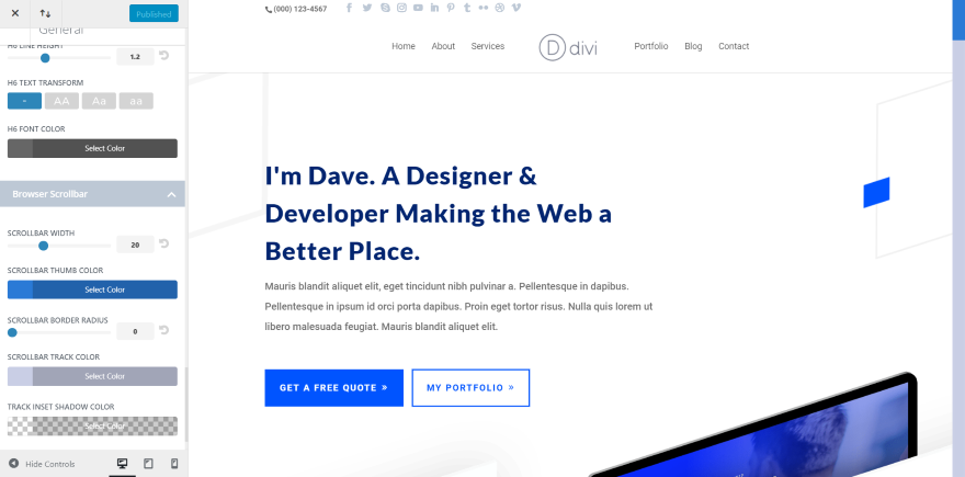这是自定义程序中的“常规”选项卡,我可以在其中调整已启用的设置。 设置包括标题和字体、浏览器滚动条和登录屏幕。 在此示例中,我对 h1 和正文文本进行了一些调整,并为滚动条添加了样式。 我还添加了更多社交图标。