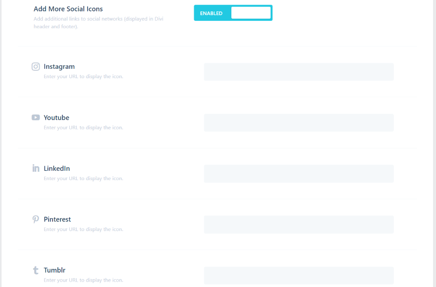 添加更多社交图标会打开一个字段,您可以在其中输入另外 9 个社交网络的 URL。