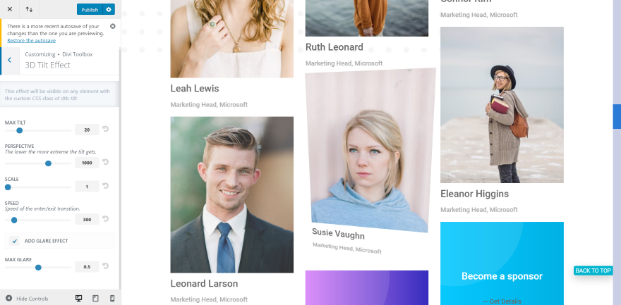 下面来看看倾斜功能。 您可以调整倾斜度、视角、比例、速度和眩光。 将其添加到任何部分、行或模块。