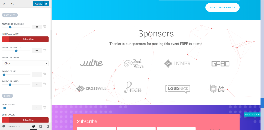 这是移动的粒子。 您可以完全控制颜色、形状、粒子数量、速度、大小、线条大小、不透明度和交互性。 有两个用于粒子的 CSS ID,让您有两种不同的设计。