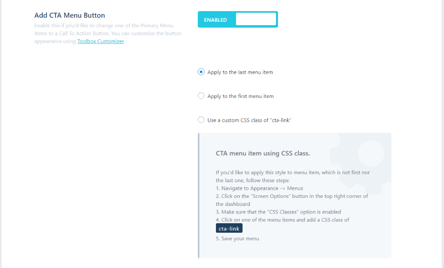 CTA 菜单按钮可让您将 CTA 应用于第一个或最后一个菜单项,或应用自定义类。 它提供了 CSS 和有关添加它的位置的说明。