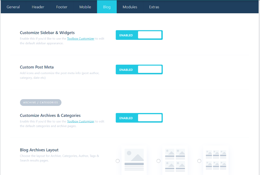 博客设置允许您自定义侧边栏和小部件、帖子元、存档和类别页面、选择布局(从 6 个选项中)、隐藏存档侧边栏以及自定义阅读更多按钮文本。