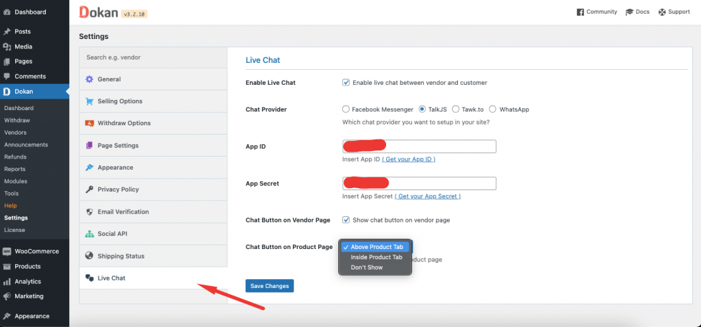 Dokan 与许多实时聊天选项集成。 管理员需要启用实时聊天模块才能将实时聊天集成到他们的市场中。 管理员可以选择要集成的实时聊天(TalkJS、Messenger、Whatsapp、Tawk.to)、App Secret、App Id,以及是否在供应商页面和产品页面上包含聊天按钮。
