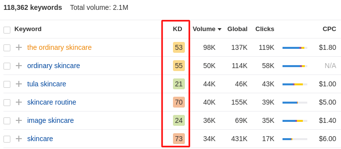数量最多的关键词真的很难排名。 相反,看看美容精华产品的关键词: