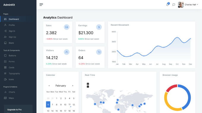 如果您现在或将来需要从您的管理模板中获得更多信息,可以使用专业版的 Argon Dashboard。 升级后可用组件的数量从 100 个增加到 200 个,您可以访问的插件数量从 4 个增加到 16 个。升级到 Argon Dashboard Pro 的用户还可以使用 25 个示例页面,而不是 6 个。然而,尽管升级的优势很明显,没有必要因为免费版本是一个非常有能力的选择。