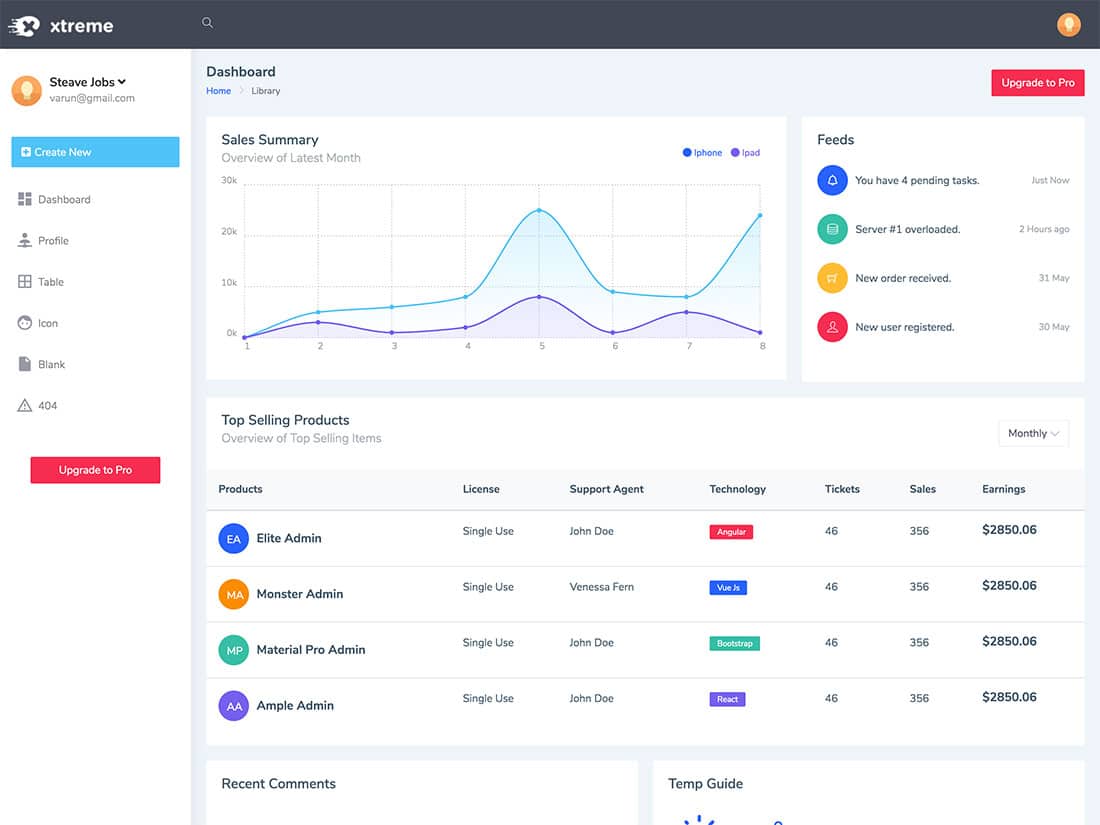 如果您想访问更多功能,可以升级到 Xtreme Bootstrap Admin Lite 的 Pro 版本。 这样做可以让您访问更多仪表板变体,包括电子商务选项和分析模板、向仪表板添加更多应用程序(例如聊天和电子邮件应用程序)的能力,以及可用于快速添加更多页面的模板选择到您的仪表板。