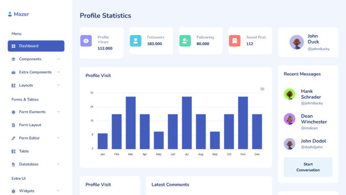 除了经典设计之外,MaterialPro 还具有一组有用的功能,可帮助您启动自己的自定义控制面板。 不同的图表小部件都很好地呈现并准备好连接到您的数据源。 但是,用户资料和联系人元素非常令人印象深刻,应该会吸引任何创建需要显示此信息的仪表板的人。