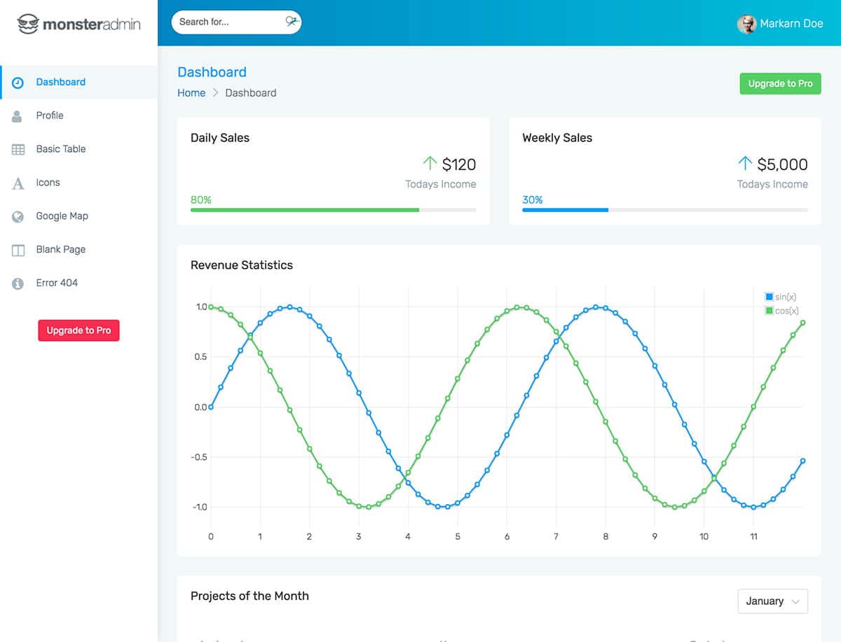尽管此模板的 Pro 版本提供了很多功能,但 Monster Admin lite 仍然是您项目的不错选择。 如果您确实为管理页面选择了 Monster Admin,那么您的仪表板将具有高度专业的设计和外观。 整体风格最好被描述为一个极简的 UI 工具包,但有足够的元素以避免看起来平淡无奇。 但是,Monster Admin 的设计永远不会掩盖您的应用程序或网站的主要功能。