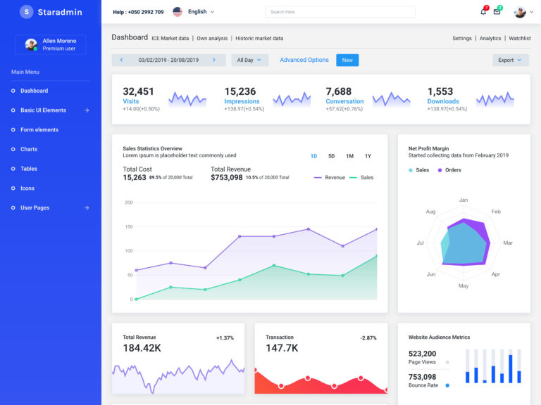 在 Star Admin 模板中使用的小部件以及您可以添加到页面的其他元素中,您会发现天气、销售、门票和性能历史小部件等等。 您可以添加到页面的其他元素包括按钮、表单、表格和图表。 事实上,Star Admin 的图表是这个免费的 Bootstrap 管理模板的真正亮点,这要归功于它们迷人的外观。 图表可以配置为实时显示数据,使您的仪表板对您的用户更加有用。 有六种类型的图表元素可供选择,这可能是为您的项目选择 Star Admin 的一个很好的理由。 还有很多图标可以添加到您的页面,包括基于通知的图标,用于向您的用户显示警报。