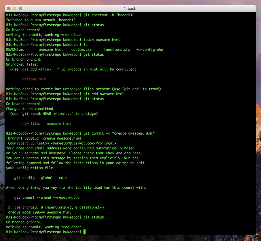 - 和以前一样,你将git status, git add awesome.html, git commit -m “create awesome.html”