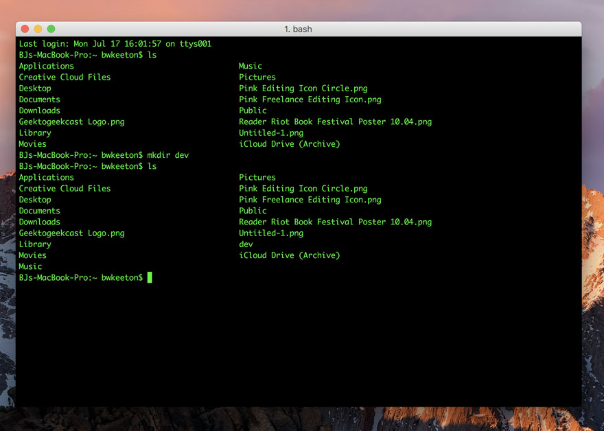 然后你想使用cd dev移动到你的新目录,这是更改目录的命令。 看,命令行一点也不可怕! 如果需要返回上一个目录,只需使用cd .. 。