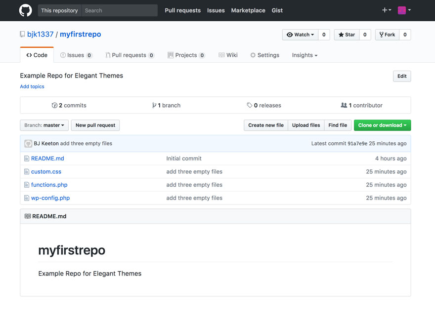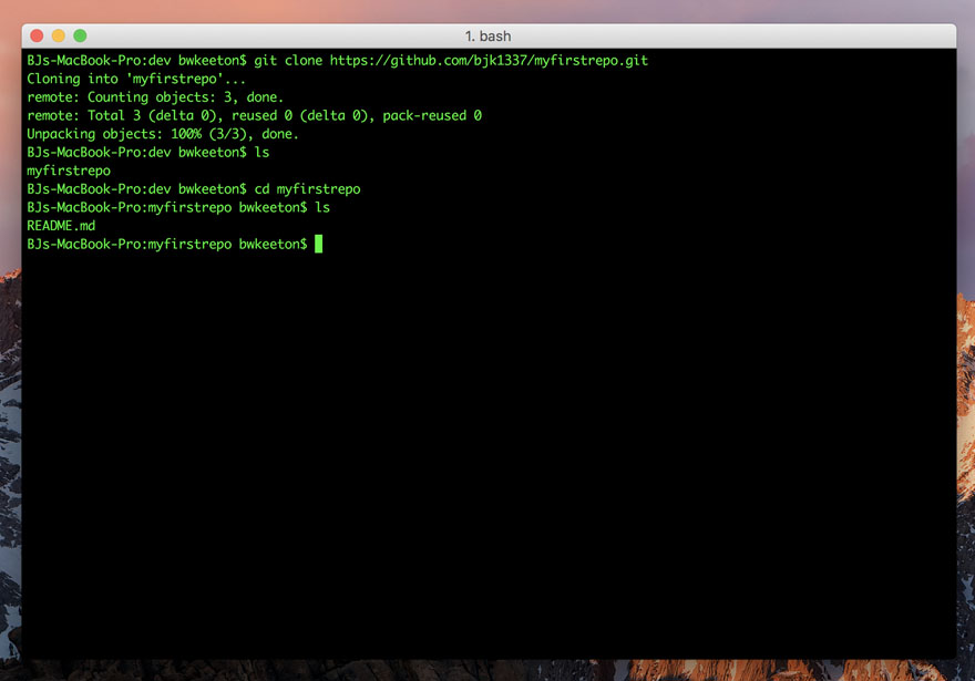 首先复制单击 Github 上绿色“克隆或下载”按钮后出现的 URL。 它看起来像这样: https : //github.com/bjk1337/myfirstrepo.git