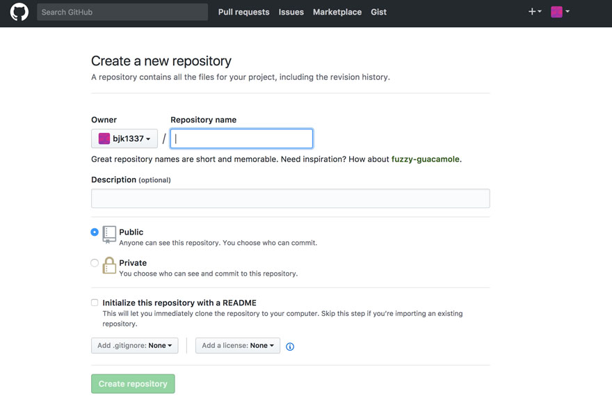 您首先需要在 Github 中设置存储库。 您也可以在计算机上完成,然后上传,但先在网络上完成更简单。