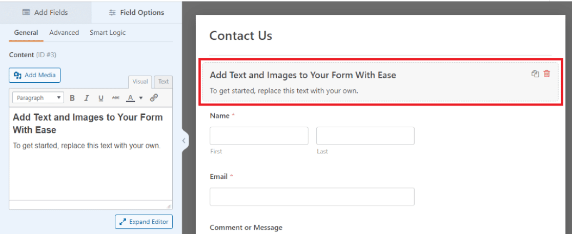 幸运的是,使用 WPForms 很容易做到。 WPForms 中的内容字段简化了将文本和媒体(如图像或徽标)直接上传到您的表单的过程。