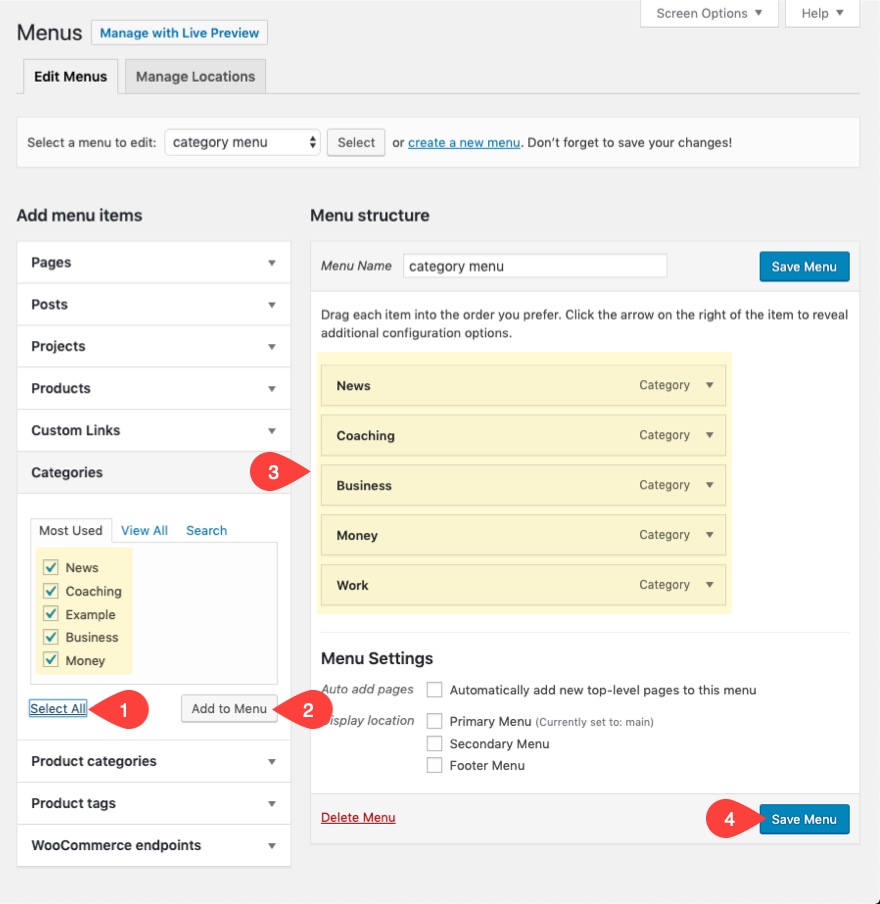 然后,从下拉菜单中选择您之前创建的类别菜单。 选择后,您的菜单项将出现在菜单中。