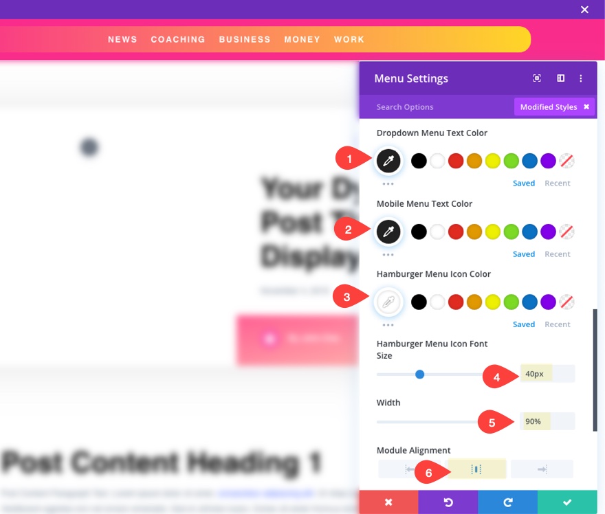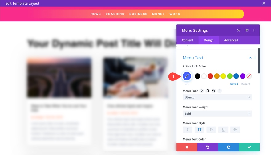 对于此模板,最好更新活动链接颜色,因为菜单项将使用此模板保存指向类别页面的链接。 打开顶部菜单设置并更新以下内容: