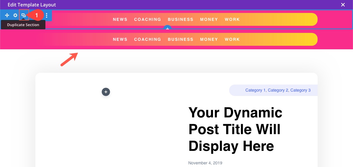 在模板布局编辑器中,创建一个具有一列行的新部分,并将其拖动到布局的最顶部。